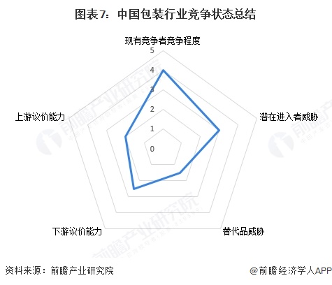 运用波特的“五力”模型,对中国包装行业的竞争环境进行分析,对各方面的竞争情况进行量化,5代表最大,0代表最小,具体五力竞争分析总结如下: