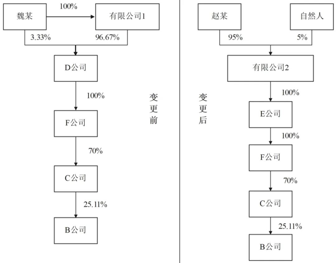2021年6月15日,B公司发布《关于实际控制人拟发生变更的提示性公告》,称实际控制人魏某控制的D公司与E公司签署了《关于F公司之股权转让协议》,约定E公司拟收购D公司持有的F公司之100%股权。B公司的控股股东C公司系F公司的全资子公司,因此本次交易完成后,B公司的控股股东仍为C公司不变,但公司实际控制人将由魏某变更为赵某。