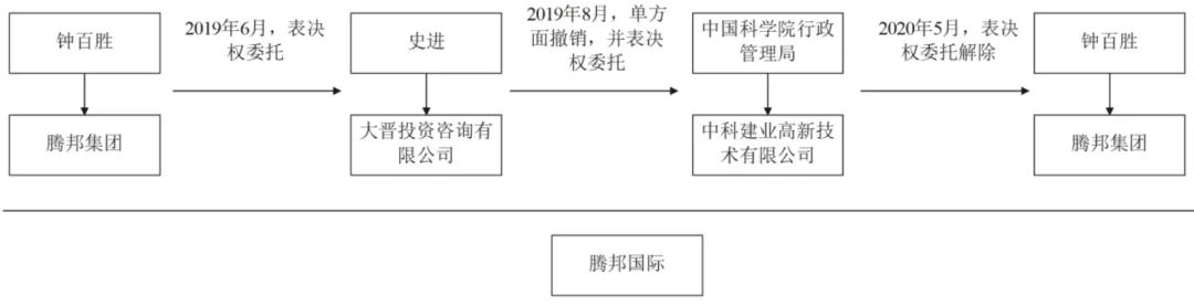 2019年8月,腾邦集团和钟百胜单方面撤销与大晋投资的《表决权委托协议》,并于同日将所持有的腾邦国际股份171,394,296股(占腾邦国际总股本的27.80%)对应的表决权委托给中国科学院行政管理局下属企业中科建业高新技术有限公司,该次表决权委托完成后,腾邦国际实际控制人变更为中国科学院行政管理局。