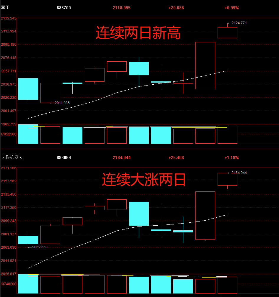 可是,这里军工板块连续两天大涨,前排持续高潮;机器人板块也连续两天大涨,前排持续高潮,明天拉谁呢?