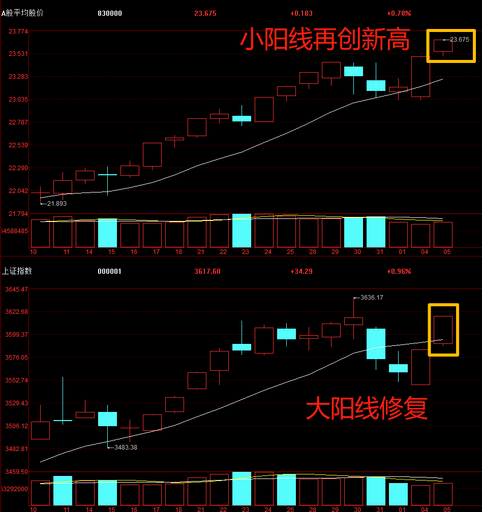 反弹修复后,今天平均股价继续新高,不过今天这个涨幅的阳线实体幅度和指数比起来,似乎是差了点意思。