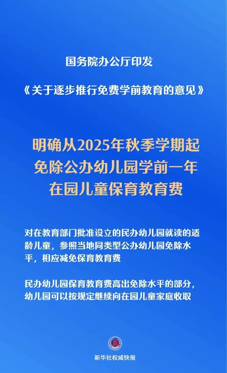 7、国办:从2025年秋季学期起 免除公办幼儿园学前一年在园儿童保育教育费