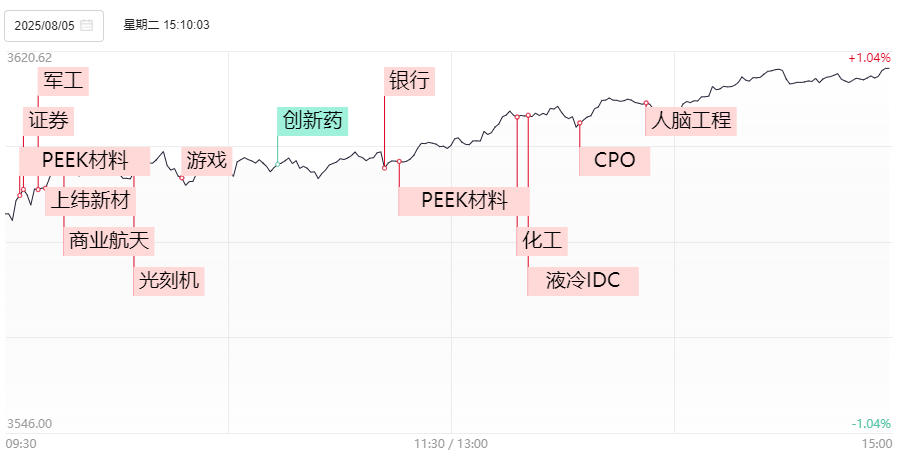 三大指数午后拉升集体收涨,截至收盘,沪指涨0.96%重返3600点,深证成指涨0.59%,创业板指涨0.39%。两市个股涨多跌少,上涨个股超3900只;两市全天成交1.60万亿元,较上一日放量成交975亿元,内资主力资金净卖出159.8亿元;两市涨跌中位数为0.63%。盘面上,银行、保险、券商集体拉升护盘,题材概念多数上行。兵装重组、军工电子、卫星导航等军工产业链持续走强,金利华电、长城军工等涨停;PEEK材料、人形机器人概念再度爆发,中欣氟材、中马传动等多股涨停,上纬新材复牌再度20CM涨停股价涨超13倍;午后脑机接口概念爆拉,创新医疗涨停;铜缆高速连接、液冷、光模块等AI产业链快速拉升,澄天伟业、长飞光纤等涨停;汽车零部件、空气能热泵等汽车产业链全天强势,正裕工业、申达股份等多股涨停;消费电子、苹果概念等拉升,福日电子、朗特智能等涨停;房地产产业链反弹,上实发展涨停;光刻机、3D打印、钢铁、化工等概念全线上行。跌幅方面,西藏板块领跌两市,奇正藏药一度跌停;中药、创新药、仿制药、CRO等医药概念全线回调,科拓生物跌超10%;智谱AI、Sora、多模态等AI应用概念集体走低;电子布、摩尔线程、华为鲲鹏等概念表现弱势。消息面上,1、上周美国非农数据再添美国经济放缓迹象,市场押注美联储将实施降息救市,美联储戴利表示,降息时机临近,年内降息次数更有可能大于两次;2、7月A股新开户数196万户,同比增长71%,远超去年同期开户水平;3、陆军首次披露无人化作战模式,无人机“蜂群”、机器“狼群”协同作战演习;4、中国房地产业协会8月4日发布通知,支持服务中小房企的健康发展,破解中小房企发展难题;5、特斯拉Optimus V3人形机器人亮相,3.5万美元终结体力劳动;6、璞璘科技交付中国首台半导体级步进纳米压印光刻系统。
