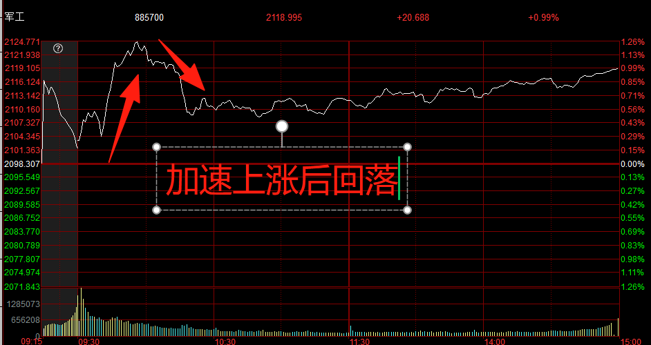 其实今早的情绪给我一种很不踏实的感觉,一方面昨天的军工今早还有一个小小的加速,早上那波快速冲高后是有回落的: