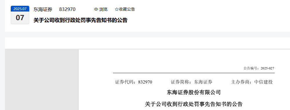 东海证券股份有限公司(以下简称“东海证券”或“公司”)于2023年2月6日收到《中国证券监督管理委员会立案告知书》(证监立案字0392023015号),具体详见公告(公告编号:2023-024)。公司于2025年7月3日收到《行政处罚事先告知书》(处罚字〔2025〕55号),具体详见公告(公告编号:2025027)。