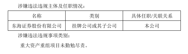 经中国证监会查明,东海证券在担任金洲慈航集团股份有限公司2015年重大资产重组独立财务顾问的项目中,出具的相关文件存在重大遗漏、虚假记载,在独立财务顾问业务中未勤勉尽责,包括:未为尚未完结的持续督导工作重新指定财务顾问主办人;未审慎核查其他中介机构出具的专项报告;未保持职业怀疑,未对标的公司业绩承诺实现情况进行充分核查和验证。
