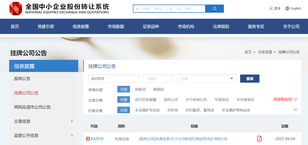 公司于2025年8月1日收到《行政处罚决定书》(〔2025〕105号),经中国证监会查明,东海证券在担任金洲慈航集团股份有限公司2015年重大资产重组独立财务顾问的项目中,出具的相关文件存在重大遗漏、虚假记载,在独立财务顾问业务中未勤勉尽责,包括:未为尚未完结的持续督导工作重新指定财务顾问主办人;未审慎核查其他中介机构出具的专项报告;未保持职业怀疑,未对标的公司业绩承诺实现情况进行充分核查和验证。