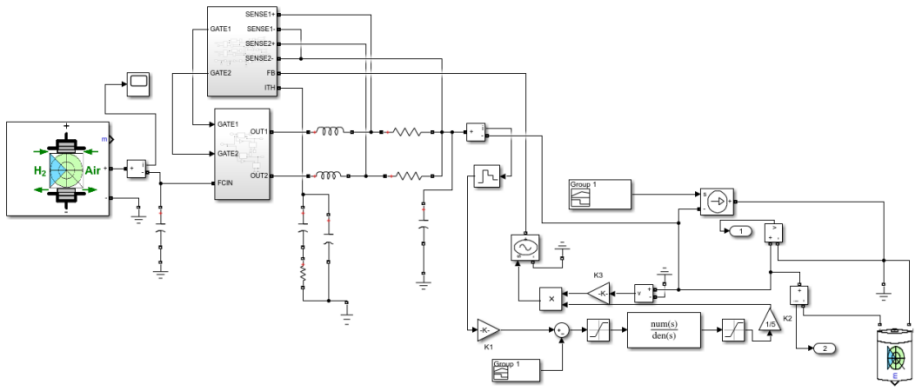 因此,陈程远等在《基于基于氢燃料电池的电动汽车混合动力系统设计》中,通过选用两相交错并联buck电路作为变换器,利用文章中提出的功率分配单元结合峰值电流控制模式,搭建了氢燃料电池车混合动力系统仿真模型。仿真结果表明,通过采用设计DC/DC变换器的反馈补偿网络可对氢燃料电池的输出功率进行控制和管理,从而对混合动力系统进行能量管理,实现了氢燃料电池动力系统能量的合理分配,使得文章中所设计的混合动力控制系统能够为负载提供充足动力并迅速跟踪负载的变化,并且验证了混合动力系统的可控性。