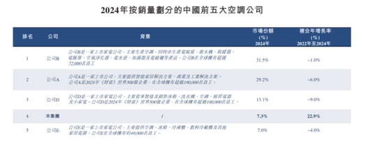 弗若斯特沙利文资料显示,2024年按销量划分的中国前五大空调公司,奥克斯排名中国第四,市场份额为7.3%