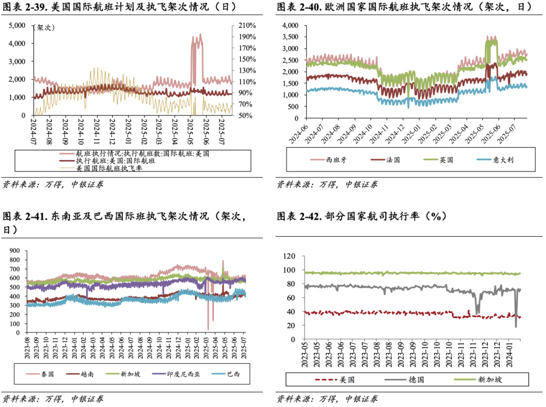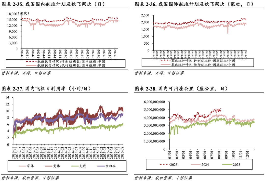 国内飞机日利用率环比上升。2025年8月2日﹣2025年8月8日,中国国内飞机利用率平均为8.89小时/天,较上周日均上升0.04小时/天;窄体机利用率平均为8.91小时/天,较上周日均上升0.06小时/天;宽体机利用率平均为10.41小时/天,较上周日均值下降0.22小时/天。