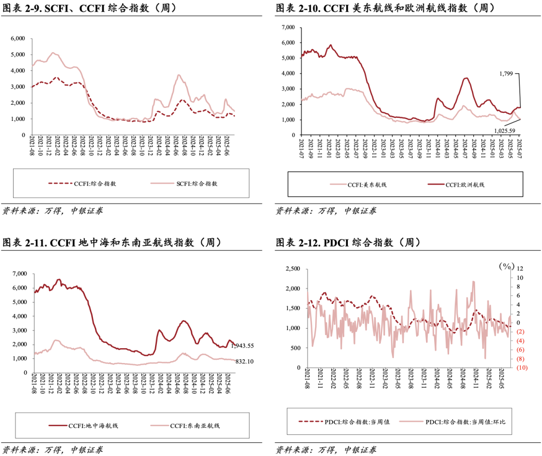 ①原油运价大幅回暖,美线集运运价继续下行。8月7日,上海航运交易所发布的中国进口原油综合指数(CTFI)报1057.44点,较7月31日上涨20.1%。本周VLCC市场中东航线多个货盘集中进场,船东挺价情绪提振,成交运价在上周接近年内低位后逐步回升。大西洋航线巴西货盘增多,西非货盘中规中矩;美湾航线私下寻船较多,活跃度小幅上扬。随着欧派克9月份增产计划的落地,船东信心也逐步回暖。目前,整体船位依旧够用,中东航线8月下旬货已经完成过半,租家有充足的时间掌控出货节奏,能否持续反弹仍依赖后续出货量的有效支撑。本周,欧线运输市场供求关系较为疲软,市场运价继续回落。8月8日,上海港出口至欧洲基本港市场运价(海运及海运附加费)为1961美元/TEU,较上期下跌4.4%。美线方面,本周,运输需求缺乏进一步增长的动能,市场运价继续调整。8月8日,上海港出口至美西和美东基本港市场运价(海运及海运附加费)分别为1823美元/FEU和2792美元/FEU,分别较上期下跌9.8%、10.7%。②黄埔发布“3+9+N”低空航线网,深圳eVTOL首穿150公里海域。7月29日,广州开发区、黄埔区召开低空经济推介会并成立产业联合会,现场首次公布区级“3+9+N”起降点布局及“人”字形主航道,50余家链上企业到场。8月3日,中国自主研发的2吨级eVTOL“凯瑞鸥”从深圳起飞,58分钟飞抵惠州19-3海上石油平台,完成全球首次海上平台运输。③广东快递底价集体上调,8月货运新规集中落地。8月4日起广东省执行快递底价不低于1.4元/票,较此前普涨0.4元/票,成为“反内卷”政策在物流落地的首个省级案例。7月底,交通运输部召开“加强货车司机合法权益保障”专题发布会,推动货运市场进入高质量发展新阶段