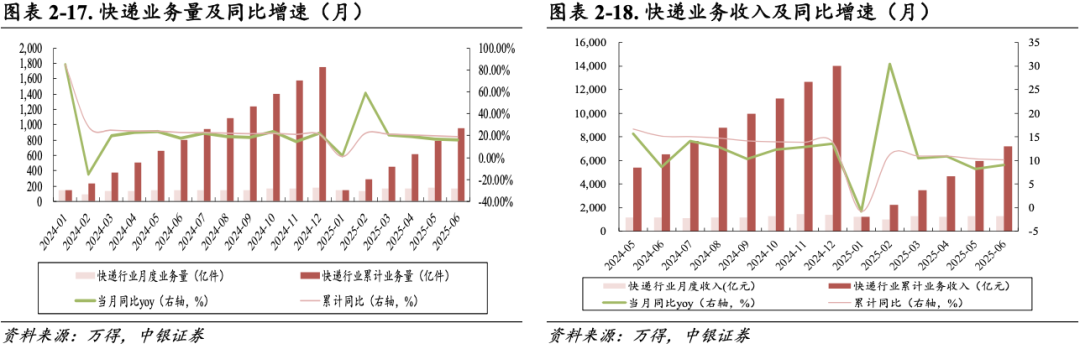 2025年6月快递业务量同比上升15.78%,快递业务收入同比增加9.00%。2025年6月月度快递业务量168.7亿件,同比增加15.78%,环比减少2.60%,快递业务收入完成1263.20亿元,同比增加9.00%,环比增加30.61%;2025年1-6月累计快递业务量956.43亿件,同比增加19.31%,2025年1-6月快递业务收入7187.80亿元,同比增长10.07%。