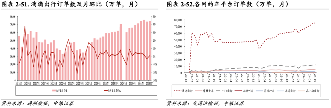 滴滴出行2024年10月份市占率79.54%,环比下降0.64%。2024年10月,滴滴出行、曹操专车、T3出行、万顺叫车、美团打车、享道出行、花小猪出行市占率分别为79.54%/5.07%/12.23%/0.35%/0.94%/1.64%/0.24%,环比上月分别-0.64pct/+0.15pct/+0.41pct/-0.01pct/-0.02pct/+0.01pct/+0.00pct。