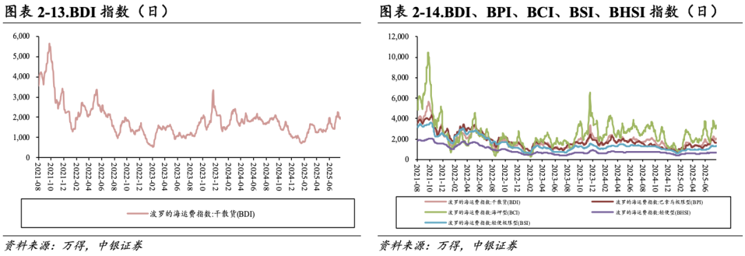 干散货:BDI指数环比上涨,报收2051点。2025年8月8日,波罗的海干散货指数(BDI)报收2051点,周环比+1.64%,同比+21.87%,分船型看,巴拿马型、海岬型、轻便型、轻便极限型运价指数分别报收1635/3342/683/1320点,环比-0.55%/-1.40%/+0.74%/+4.02%,同比+0.93%/+35.91%/-9.66%/+1.38%。我们认为BDI中长期走势需要观察全球工业经济恢复情况,可以持续动态跟踪世界钢铁产量、澳大利亚和巴西铁矿石出口、中国煤炭进口等指标。