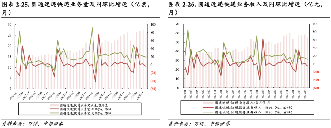 圆通速递:2025年6月快递业务量26.27亿票,同比上升19.30%,环比下降4.96%,业务收入55.27亿元,同比上升11.36%,环比下降5.51%。
