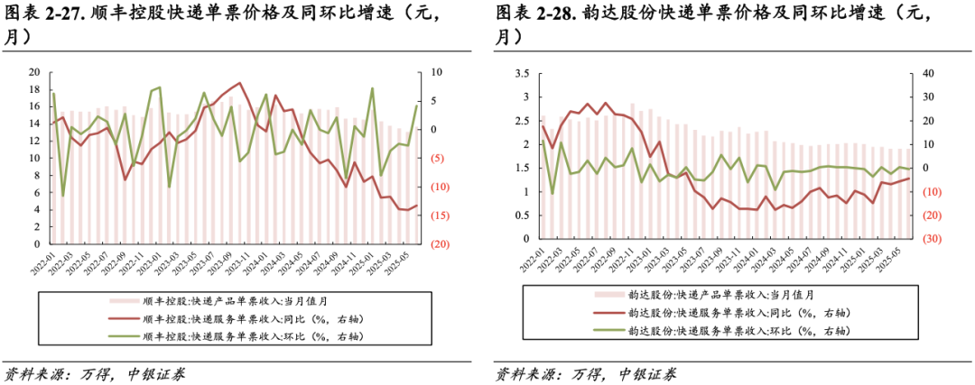 顺丰控股:2025年6月单票价格13.67元,同比-13.32%(-2.10元),环比+4.19%(+0.55元)。