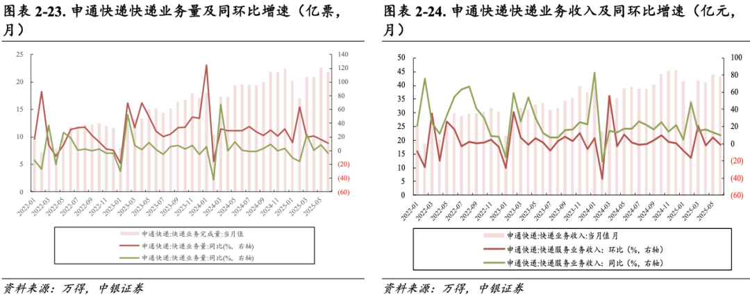 申通快递:2025年6月单票价格1.99元,同比-1.00%(-0.02元),环比+2.05%(+0.04元)。