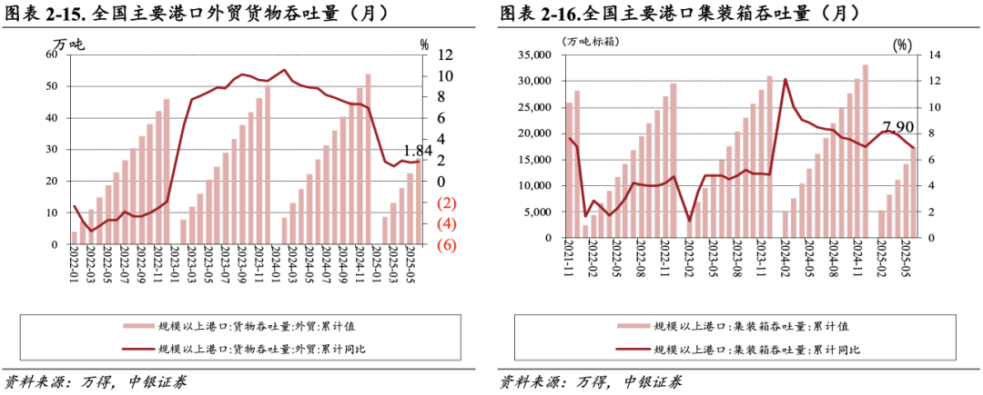 2.2.2量:2025年1-6月全国港口货物、集装箱吞吐量分别为89.03亿吨/17298万标箱
