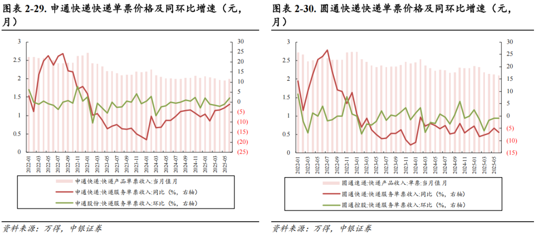 圆通速递:2025年6月单票价格2.10元,同比-6.67%(-0.15元),环比-0.94%(-0.02元)。