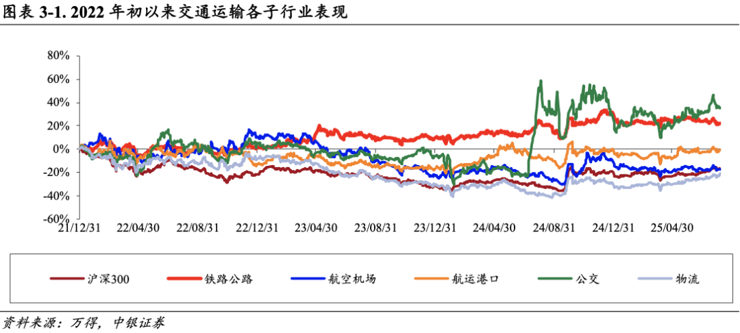 年初至今:2025年初以来,上证综指、沪深300累计涨跌幅分别为+8.45%、+4.32%,交通运输指数+0.27%;交通运输各个子板块来看,铁路公路-6.08%、航空机场-7.02%、航运港口+0.28%、公交+7.22%、物流+12.86%。