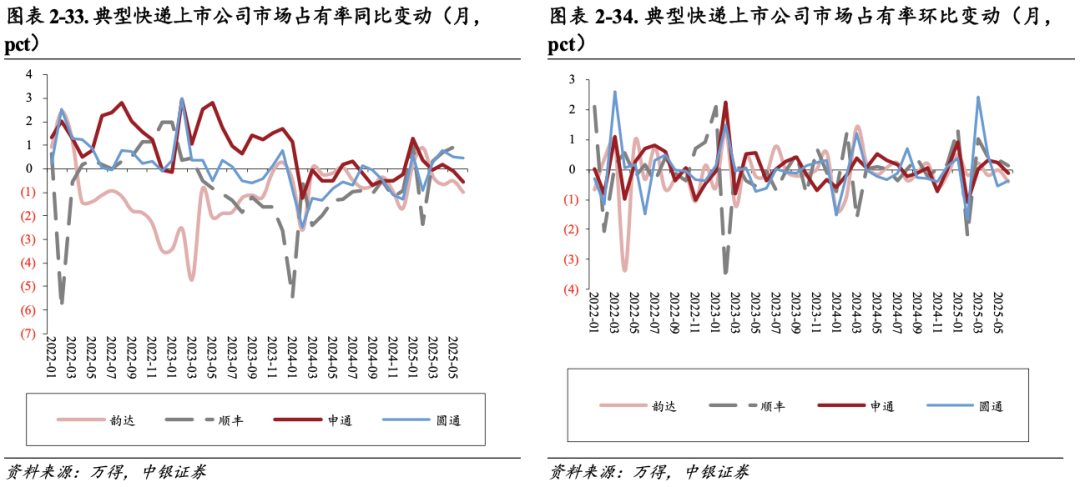 韵达股份:6月韵达的市占率为12.88%,同比-1.00pct,环比-0.42pct。