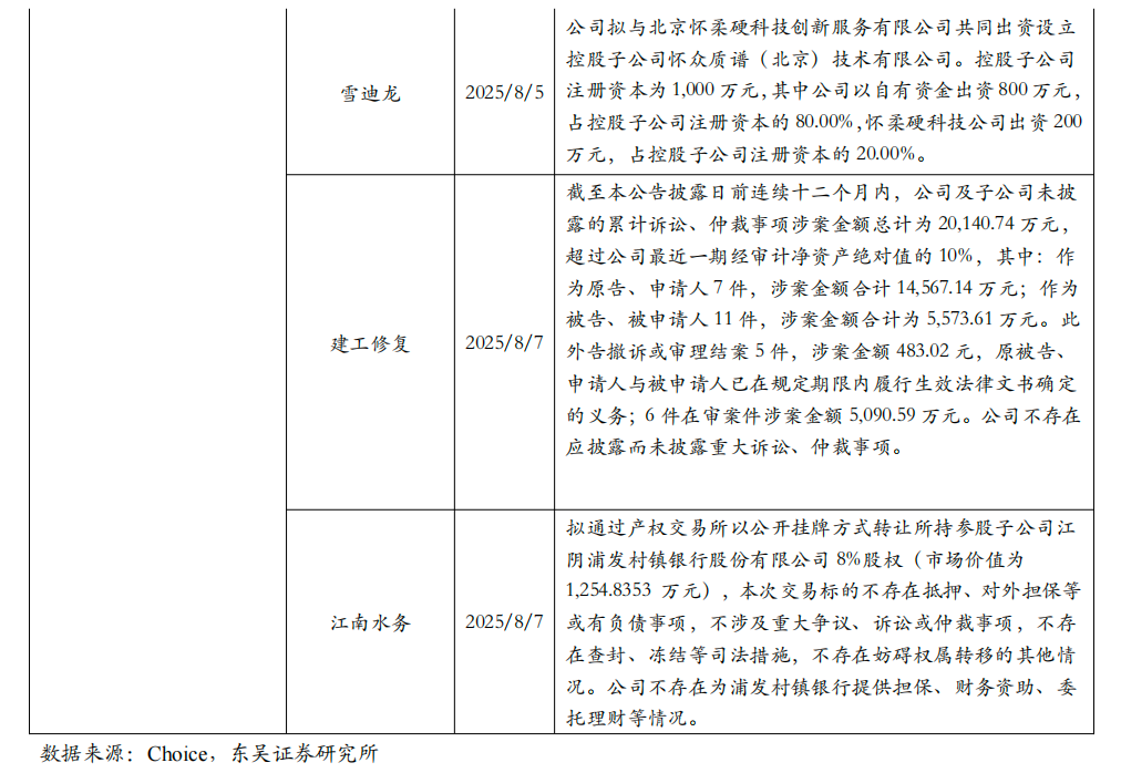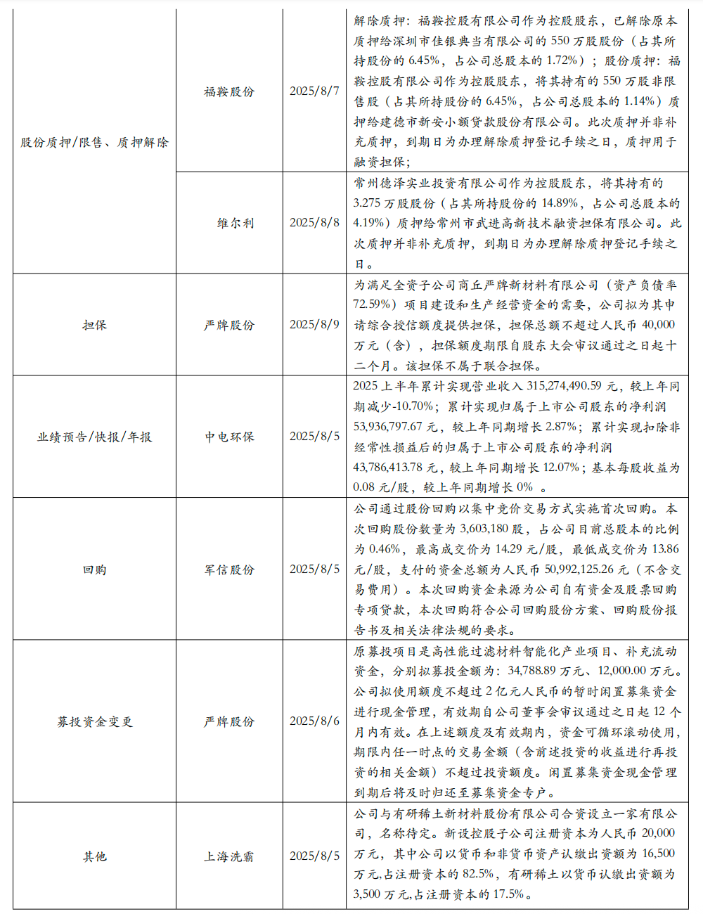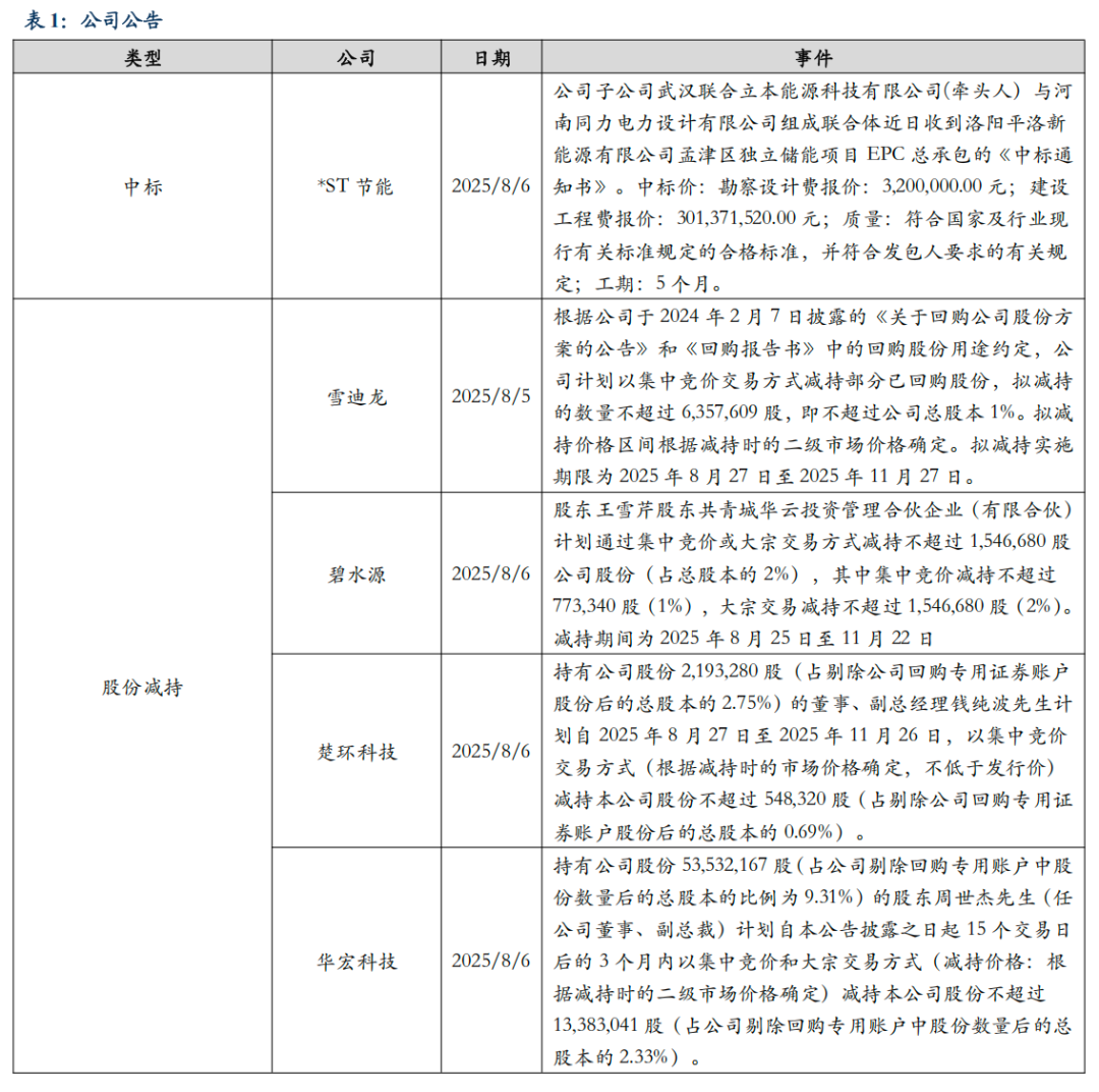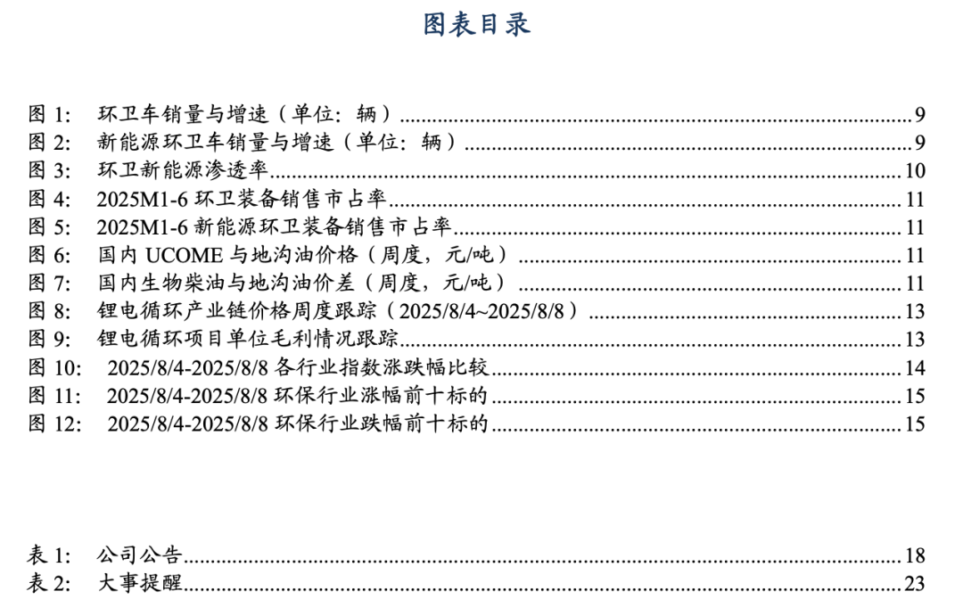 行业跟踪:1)环卫装备:2025M1-6新能源渗透率同增7.24pct至15.86%。25M1-6环卫车销量38164辆(同比+3.59 %),其中新能源6054辆(同比+90.56%),盈峰环境/宇通重工/福龙马新能源市占率分别为32%/14%/8%。2)生物柴油:生物柴油均价与上周相比持平,单吨净利回升。2025/8/1-2025/8/7生柴均价8254元/吨(周环比持平),地沟油均价6461元/吨(周环比+0.8%),考虑一个月库存周期测算单吨盈利209元/吨(周环比+11.9%)。3)锂电回收:金属价格各有涨跌&折扣系数持平,盈利下滑。截至2025/8/8,三元电池粉锂系数周环比持平,锂/钴/镍系数分别为71.0%/73.8%/73.8%。截至2025/8/8,碳酸锂7.20万(周环比+0.9%),金属钴26.6万(周环比-3.6%),金属镍12.23万(周环比+1.0%)。根据模型测算单吨废料毛利-0.39万(周环比-0.011万)。