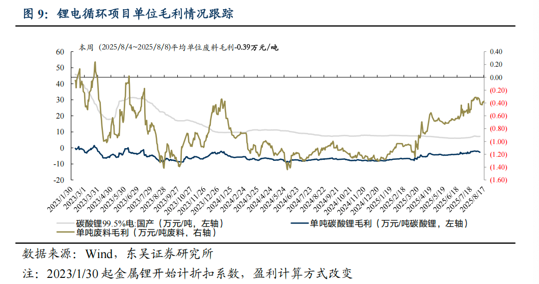 盈利跟踪:金属价格各有涨跌&折扣系数持平,盈利下滑。我们测算锂电循环项目处置三元电池料(Ni≥15% Co≥8% Li≥3.5%)盈利能力,根据模型测算,本周(2025/8/4~2025/8/8)项目平均单位碳酸锂毛利为-2.48万元/吨(较前一周-0.07万元/吨),平均单位废料毛利为-0.39万元/吨(较前一周-0.011万元/吨),锂回收率每增加1%,平均单位废料毛利增加0.037万元/吨。期待行业进一步出清、盈利能力改善。
