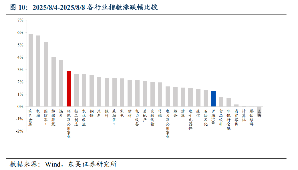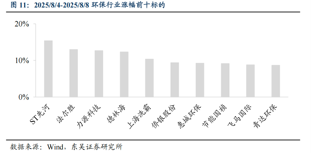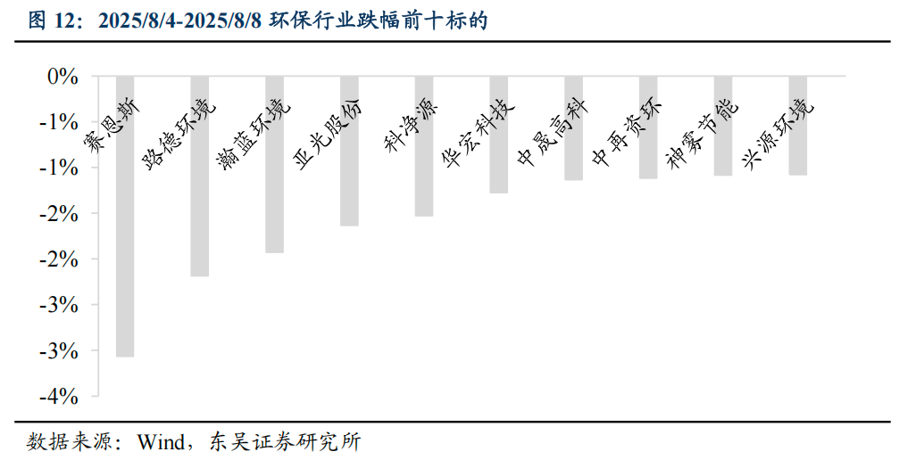 2025/8/4-2025/8/8 跌幅前十标的为:赛恩斯-3.07%,路德环境-2.19%,瀚蓝环境-1.93%,亚光股份-1.63%,科净源-1.53%,华宏科技-1.27%,中晟高科-1.13%,中再资环-1.12%,神雾节能-1.08%,兴源环境-1.08%。