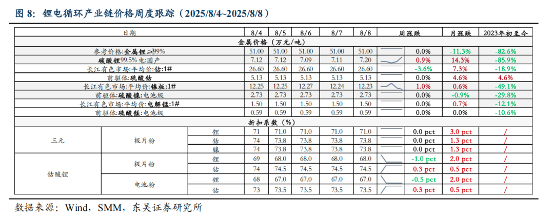 折扣系数持平。截至2025/8/8,折扣系数周环比。1)三元极片粉锂折扣系数71.0%,周环比持平;2)三元极片粉钴折扣系数73.8%,周环比持平;3)三元极片粉镍折扣系数73.8%,周环比持平。
