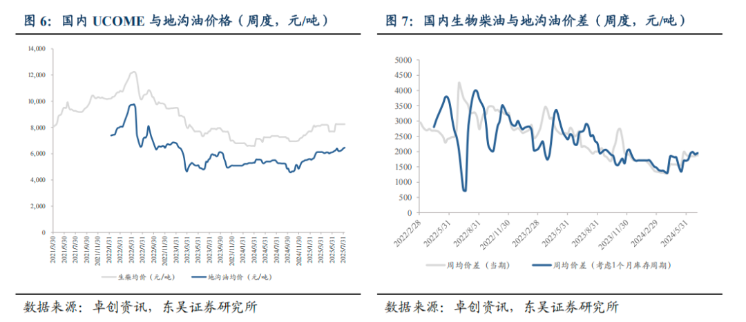 生物柴油均价持平,单吨净利回升。根据卓创资讯,1)原料端:2025/8/1-2025/8/7地沟油均价6461元/吨,环比2025/7/25-2025/7/31地沟油均价+0.8%。2)产品端:2025/8/1-2025/8/7全国生物柴油均价8254元/吨,环比2025/7/25-2025/7/31生柴均价基本持平。3)价差:国内UCOME与地沟油当期价差1793元/吨,环比2025/7/25-2025/7/31价差-2.5%;若考虑一个月的库存周期,价差为2054元/吨,环比2025/7/25-2025/7/31价差+1.0%,按照(生物柴油价格-地沟油价格/88%高品质得油率-1000元/吨加工费)测算,单吨盈利为209元/吨(环比2025/7/25-2025/7/31单吨盈利+11.9%)。废弃油脂方面,短期来看,由于前端收油量紧俏,供应面紧张,地沟油、潲水油价格下跌空间有限,外商订单需求方面不乐观,需求未有明显利好消息支撑,短期内供需双弱局面或将持续,价格或维持稳定运行;生物柴油方面,外商寻单意愿不强,市场基本处于有价无市状态,短期内价格稳中小幅波动运行。