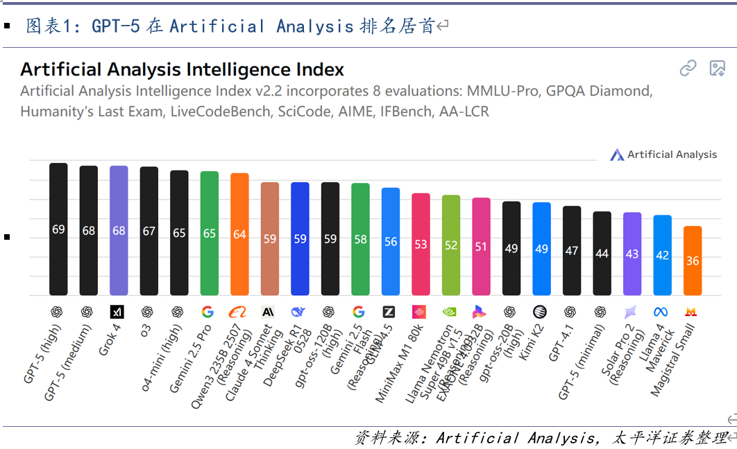 智能水平有所提升:GPT-5在主流评测集(如MMLU、ARC等)上略高于前代o3和竞品,但提升幅度小,未实现跨越式突破。在Artificial Analysis排名中居首,但优势微弱。