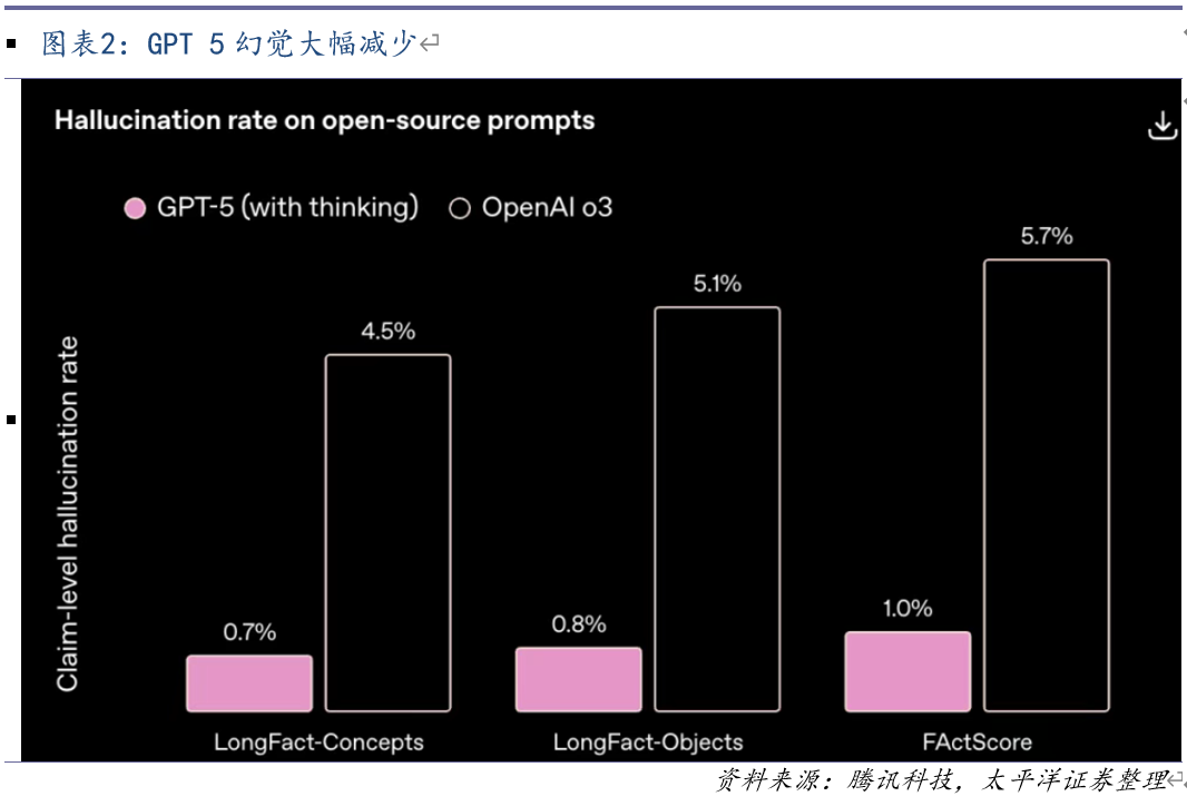 幻觉率大幅降低:GPT-5事实错误率比GPT-4o低45%,比o3低80%,仅不到1%。部分场景下模型减少欺骗行为(模型谎报或不执行任务)近90%。OpenAI通过强化训练(如使用浏览工具获取信息)和强化学习实现。