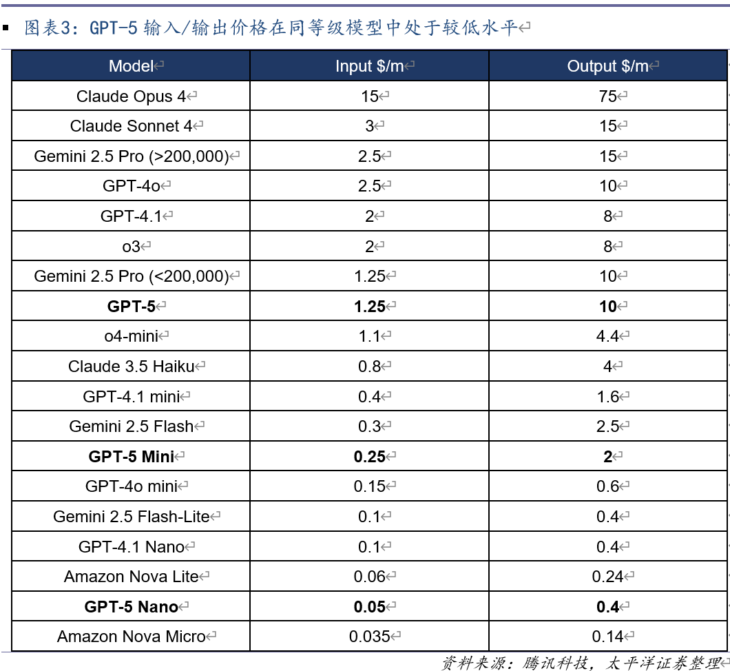 GPT-5可供C端用户免费试用,API定价优于竞品。免费用户可使用GPT-5,限额每天数小时。Plus用户具备更高额度,基本满足日常需求。API定价方面,GPT-5每百万token输入价格为1.25美元,输出为10美元,比GPT-4o更便宜,远低于竞品(如Claude Opus 4.1价格的1/15,也低于Gemini 2.5 Pro)。