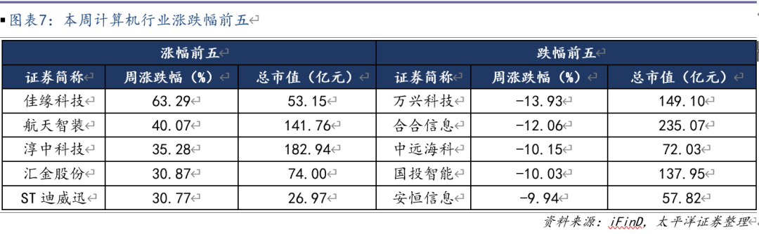 本周计算机行业涨幅前五的公司分别佳缘科技(+63.29%)、航天智装(+40.07%)、淳中科技(+35.28%)、汇金股份(+30.87%)、ST迪威迅(+30.77%);跌幅前五的公司分别为万兴科技(-13.93%)、合合信息(-12.06%)、中远海科(-10.15%)、国投智能(-10.03%)、安恒信息(-9.94%)。