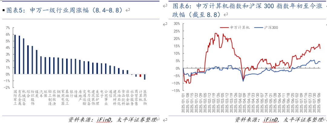行情回顾:本周(2025.8.4-2025.8.8)申万计算机行业指数下跌0.41%,在31个申万一级行业中排名第30位。截至本周五(8月8日),计算机行业指数与较年初上涨13.30%,跑赢沪深300指数8.97pct。