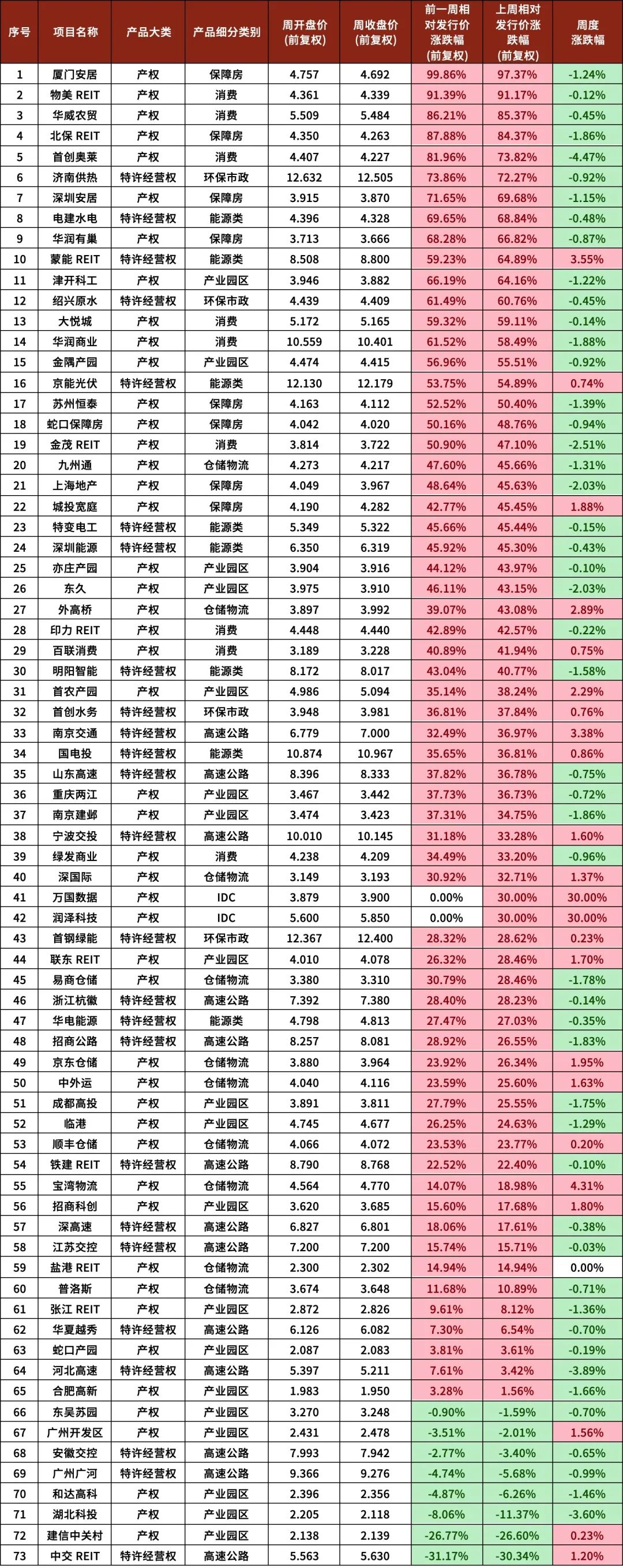 图表1 REITs价格涨跌幅汇总