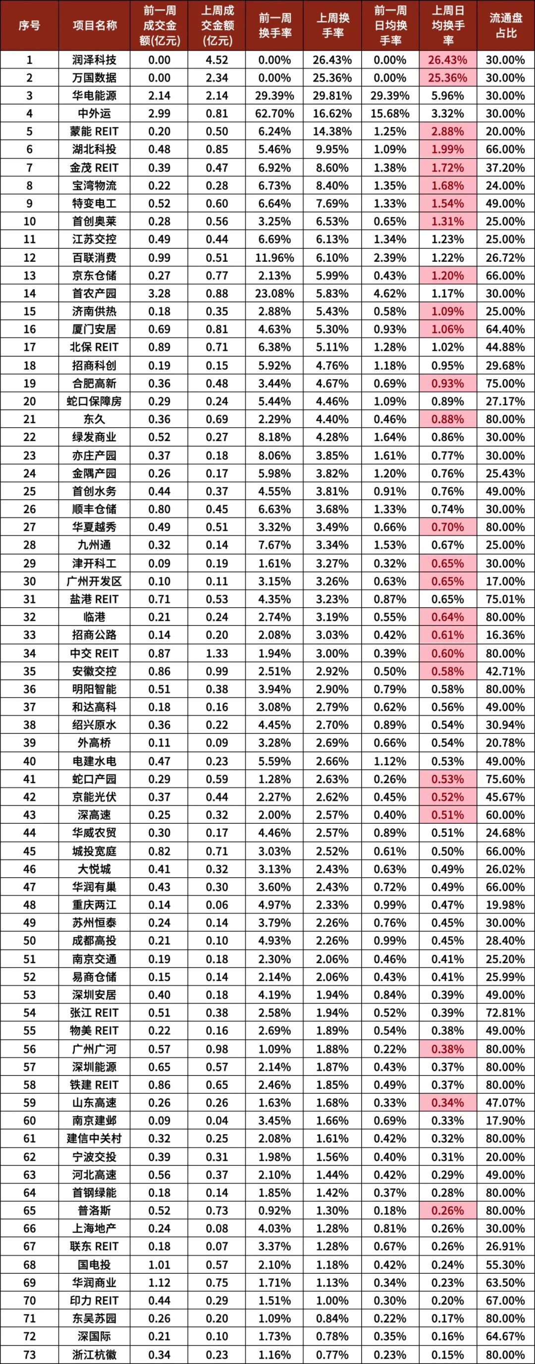 上周REITs成交额基本持平:上周REITs总成交金额为36.67亿元,与前一交易周持平,新上市的两单IDC单日贡献近7亿的成交量,若不考虑新项目,市场交投活跃度有所收缩,周五润泽科技、万国数据上市后开盘打新筹码迅速换手,随后封板,单日换手率均超过25%,近期上市的华电能源(5.96%)、中外运(3.32%)和蒙能REIT(2.88%)换手率居前。