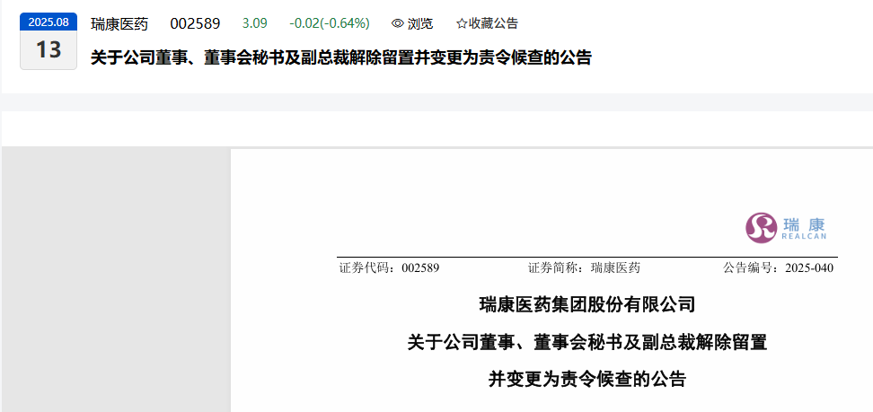 2025-08-13瑞康医药002589关于公司董事、董事会秘书及副总裁解除留置并变更为责令候查的公告