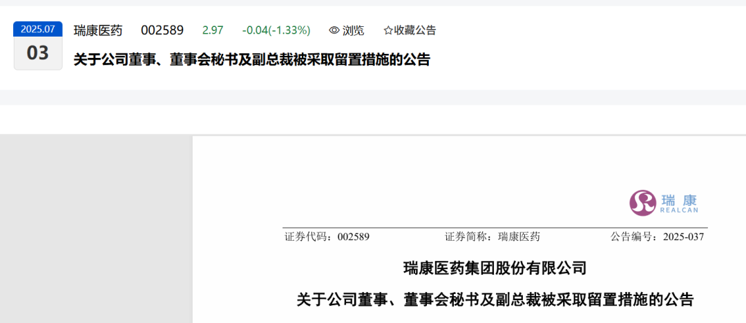 2025-07-03瑞康医药 [002589]:关于公司董事、董事会秘书及副总裁被采取留置措施的公告