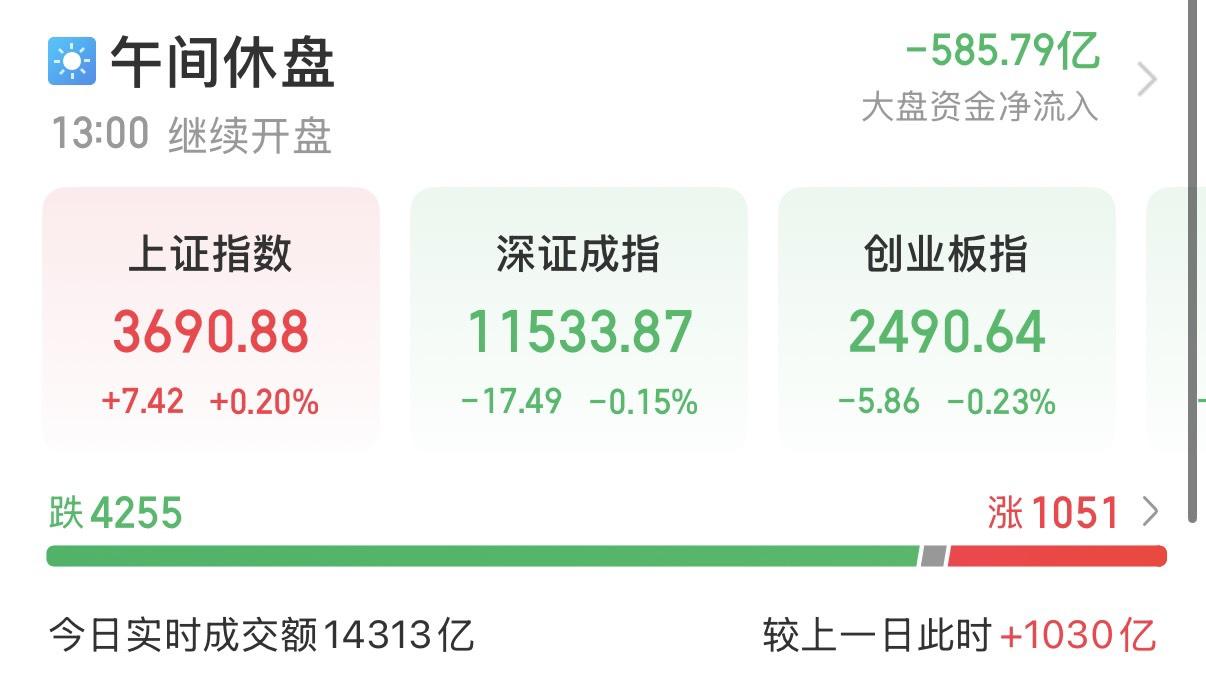 A股三大指数涨跌不一,截至午盘,沪指涨0.20%,深成指跌0.15%,创业板指跌0.23%,北证50指数跌0.98%,沪深京三市半日成交额14313亿元,较上日放量1030亿元。全市场超4200只个股下跌。