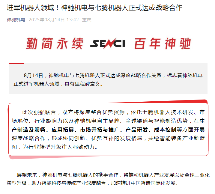 每经AI快讯,8月14日,神驰机电与七腾机器人正式达成深度战略合作关系,标志着神驰机电正式进军机器人领域。双方将深度整合优势资源,依托七腾机器人技术研发、市场地位、行业影响力以及神驰机电自主品牌、全球渠道与智能制造优势,在生产制造及服务、应用拓展、市场开拓与推广、产品研发、成本控制等方面开展深度战略合作。
