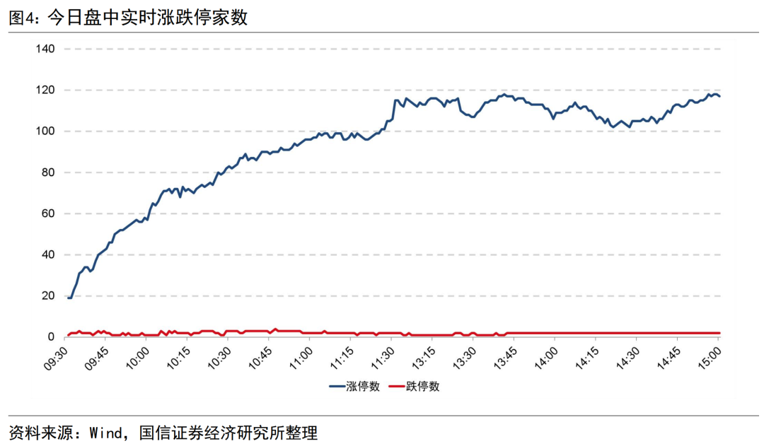 我们统计上市满3个月以上的股票在今日盘中的实时涨跌停家数情况。今日市场情绪较为高涨,盘中最高有118只股票涨停,收盘时有117只股票涨停,盘中最高有4只股票跌停,收盘时有2只股票跌停,今日日内实时涨跌停家数如下图所示。