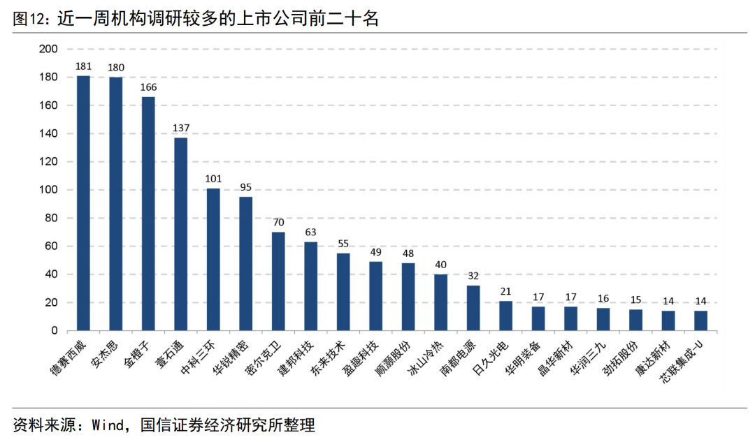 上市公司会披露投资者或分析师对其的调研活动。这里我们统计近7天内对上市公司调研或举行分析师会议的机构数量。下图展示了近一周内被机构调研较多的前二十名上市公司,不足二十名时直接取现有数量。可以看到,近一周内调研机构较多的股票是德赛西威、安杰思、金橙子、壹石通、中科三环、华锐精密、密尔克卫、建邦科技等,德赛西威被181家机构调研。