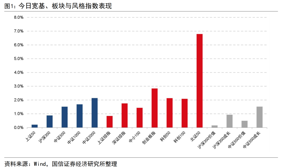 风格指数中,中证500成长指数表现较好,沪深300价值指数上涨0.16%,沪深300成长指数上涨0.93%,中证500价值指数上涨0.49%,中证500成长指数上涨1.52%。主要宽基、板块及风格指数今日表现如下图所示。