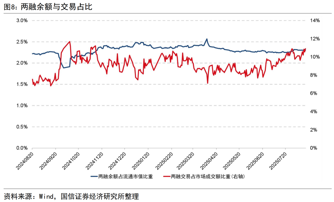 我们计算两融余额占市场总流通市值的比重与两融交易(融资买入额+融券卖出额)占市场总成交额的比例来反映两融交易的活跃情况。近一年来两融余额占流通市值的比重维持在2.3%左右,两融交易占市场成交额的比重维持在9.1%左右,截至 20250815 两融余额占流通市值比重为2.3%,两融交易占市场成交额比重为10.9%,近一年两融余额与交易占比如下图所示。