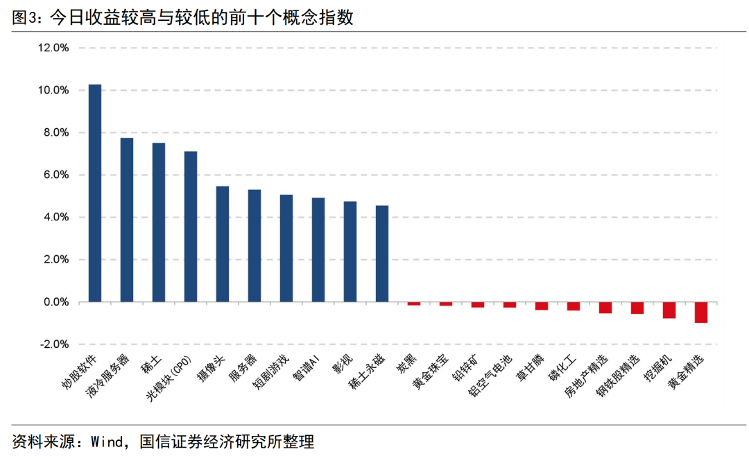 今日炒股软件、液冷服务器、稀土、光模块(CPO)、摄像头等概念表现较好,收益分别为10.28%、7.75%、7.52%、7.11%、5.47%,黄金精选、挖掘机、钢铁股精选、房地产精选、磷化工等概念表现较差,收益分别为-0.99%、-0.78%、-0.57%、-0.54%、-0.40%,今日收益较高与较低的前十个概念指数表现如下图所示。