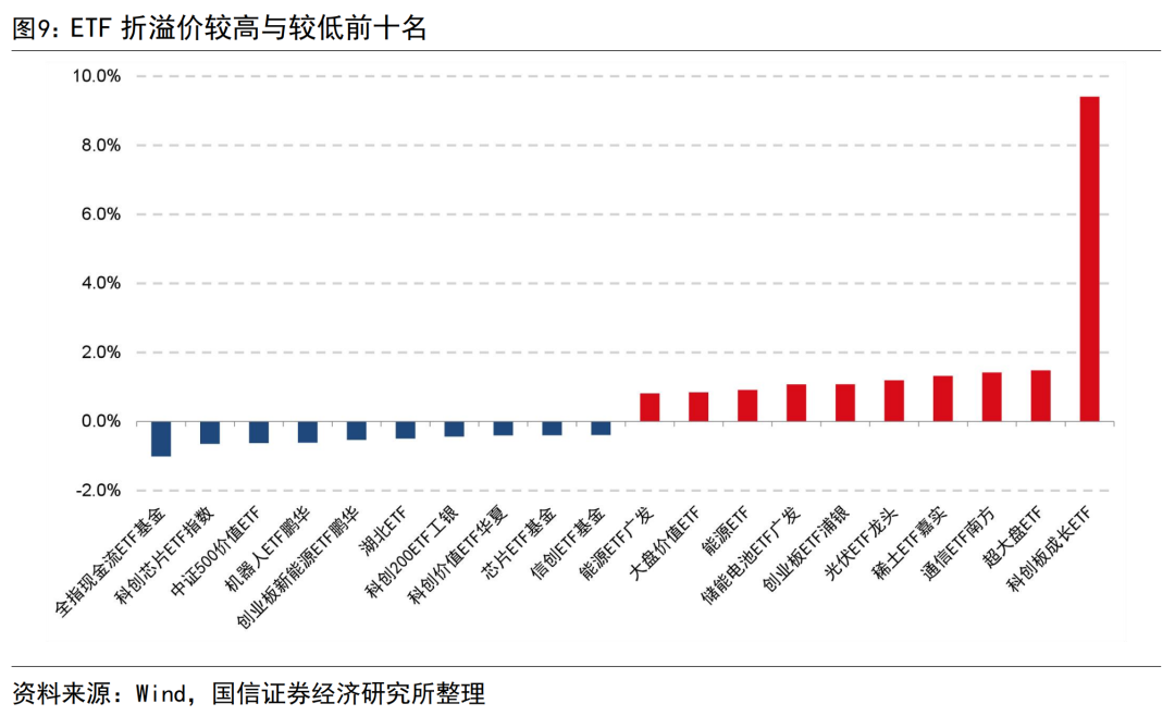 ETF是一种在交易所上市交易的、基金份额可变的开放式基金,其可在场外进行申购赎回,也可以在场内交易。其在场内交易的价格与场外价格的差距在一定程度上反映了投资者的情绪。这里我们统计日成交额超过100万的境内交易股票型ETF的折溢价情况。20250815当日溢价较多的是科创板成长ETF,溢价9.41%,折价较多的是全指现金流ETF基金,折价1.01%,折溢价较高与较低的前十名ETF如下图所示。