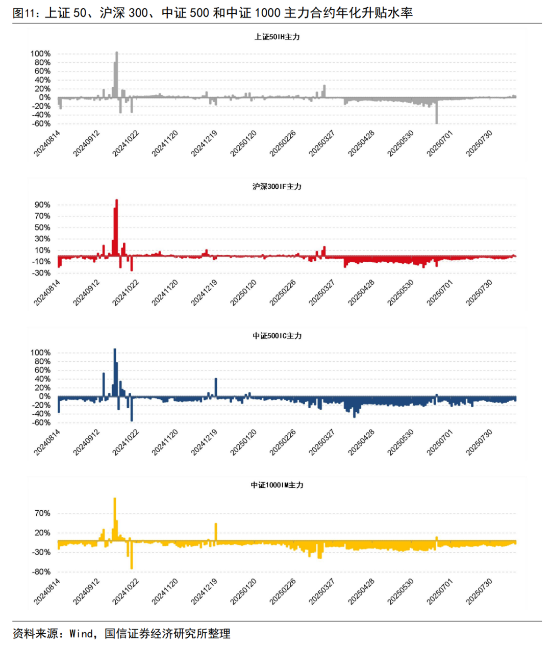 近一年以来上证50、沪深300、中证500、中证1000股指期货主力合约的年化贴水率中位数分别为0.44%、 2.67%、9.24%和11.51%,20250818当日上证50股指期货主力合约年化升水率为3.50%,处于近一年来90%分位点,具有相对较低的建仓成本,当日沪深300股指期货主力合约年化贴水率为0.40%,处于近一年来70%分位点;当日中证500股指期货主力合约年化贴水率为9.40%,处于近一年来49%分位点;当日中证1000股指期货主力合约年化贴水率为7.66%,处于近一年来70%分位点。近一年上证50、沪深300、中证500和中证1000主力合约年化升贴水率如下图所示。