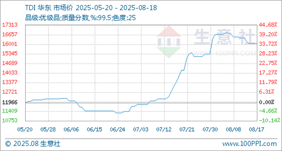 近期,化工品TDI(甲苯二异氰酸酯)价格持续上涨。根据生意社数据,8月18日,TDI基准价为16066.67元/吨。下半年以来,TDI价格累计上涨40.94%。2025年,TDI价格最低10400元/吨,最高16766.67元/吨,区间最大涨幅高达61.22%。