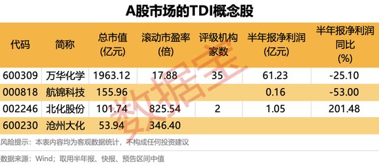 据证券时报·数据宝不完全统计,A股市场具有TDI相关产能的上市公司主要有4家,分别为万华化学、沧州大化、北化股份和航锦科技。